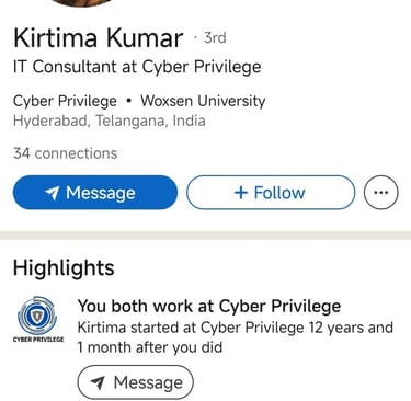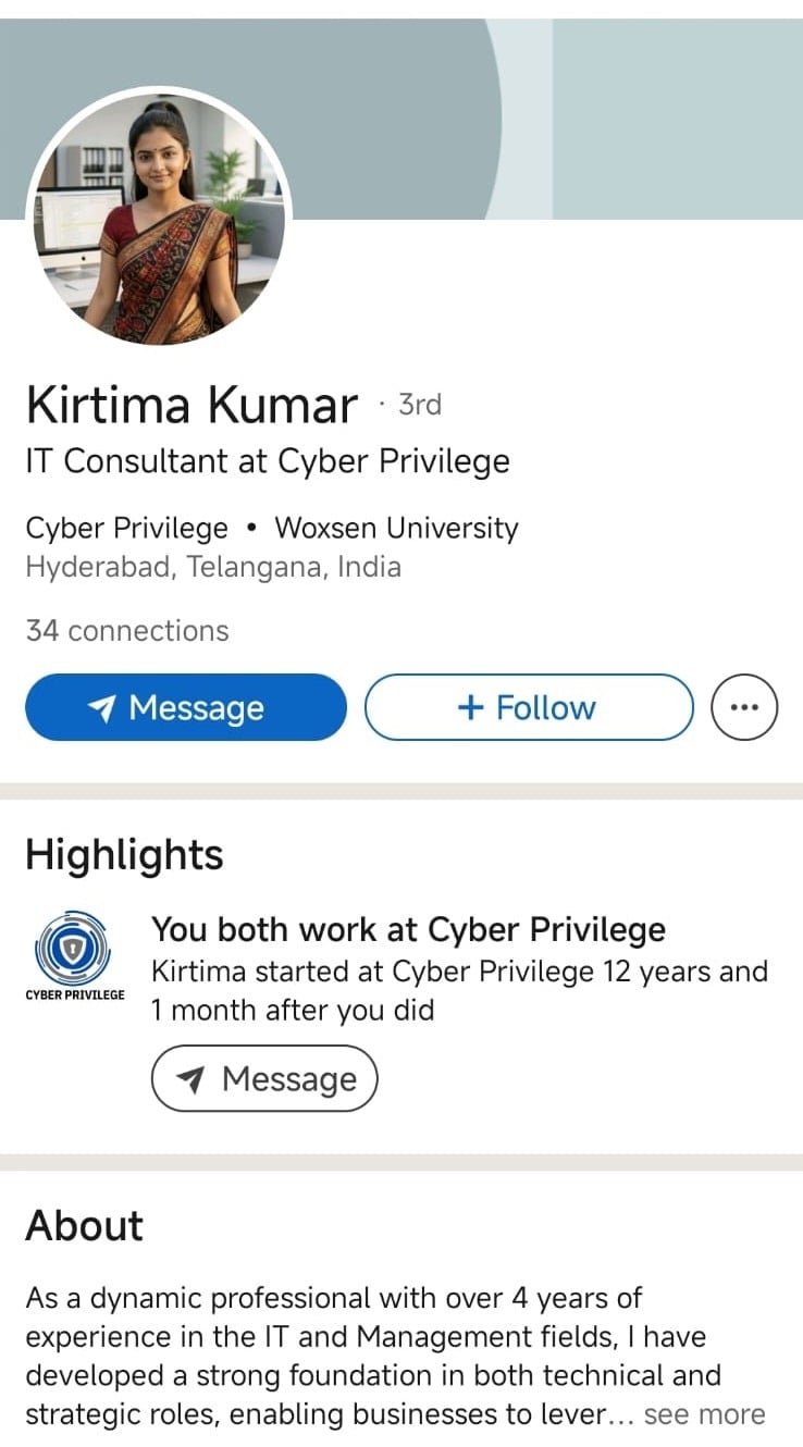 Cyber Privilege wishes to inform the public that an individual using the name βKirtima Kumarβ is falsely claiming association with Cyber Privilege.